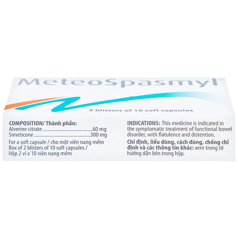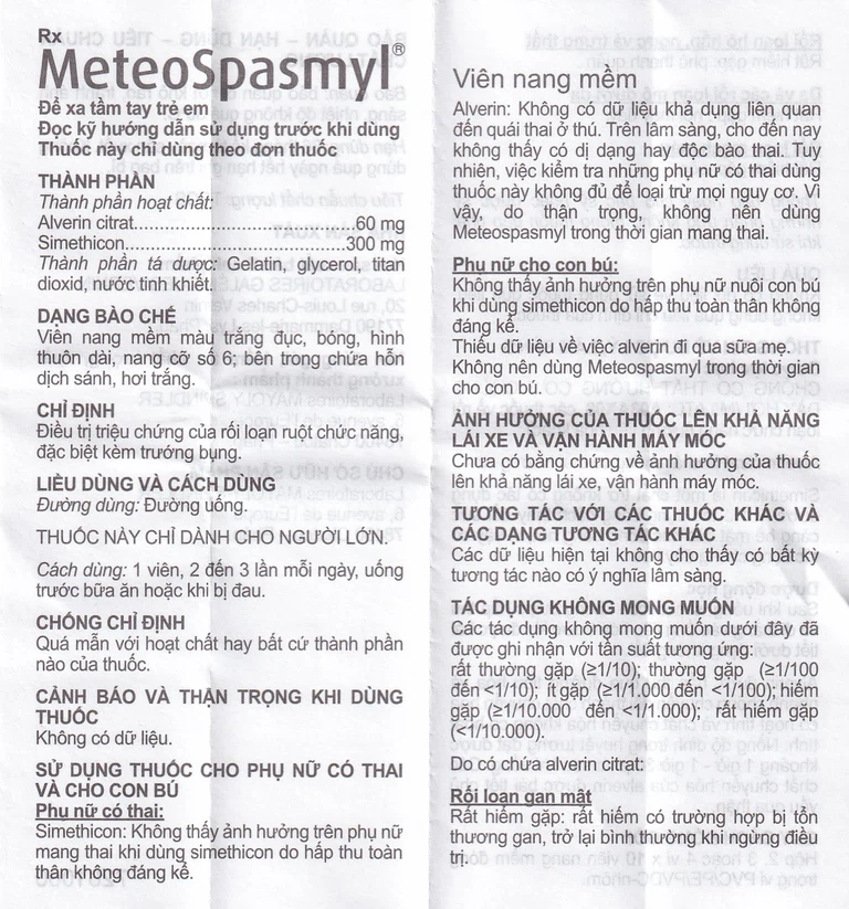 Meteospasmyl của Công ty Laboratoires Mayoly Spindler – Pháp, hoạt chất chính Alverin (hàm lượng 60mg) và Simethicone (hàm lượng 300mg), là thuốc được dùng để điều trị các rối loạn đường ruột.