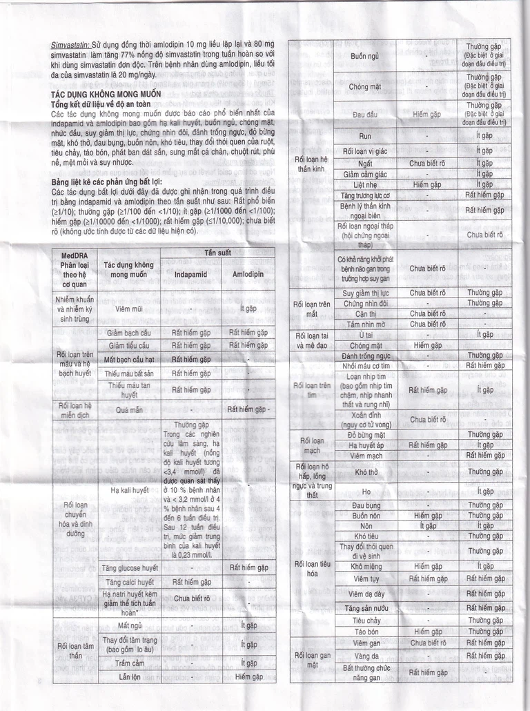 Các tác dụng không mong muốn được báo cáo phổ biến nhất của indapamide và amlodipine bao gồm hạ kali huyết, buồn ngủ, chóng mặt, nhức đầu, suy giảm thị lực, chứng nhìn đôi, đánh trống ngực, đỏ bừng mặt, khó thở, đau bụng, buồn nôn, khó tiêu, thay đổi thói quen của ruột, tiêu chảy, táo bón, phát ban dát sần, sưng mắt cá chân, chuột rút, phù nề, mệt mỏi và suy nhược.