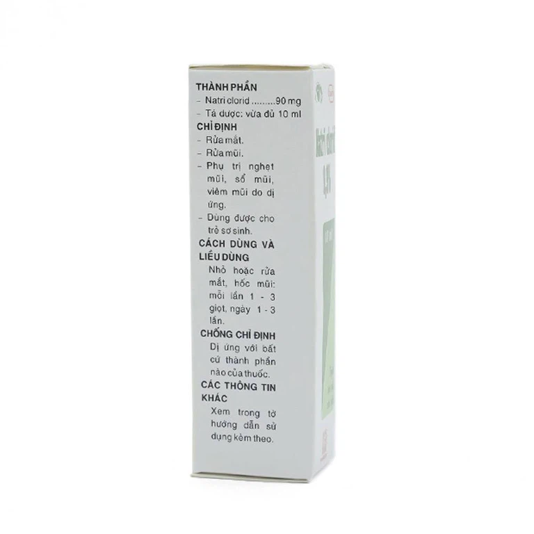 Natri clorid 0,9% là dung dịch đẳng trương được dùng rửa mắt và được dùng nhỏ mũi để giảm những triệu chứng như nghẹt mũi, chảy mũi, viêm mũi do dị ứng.