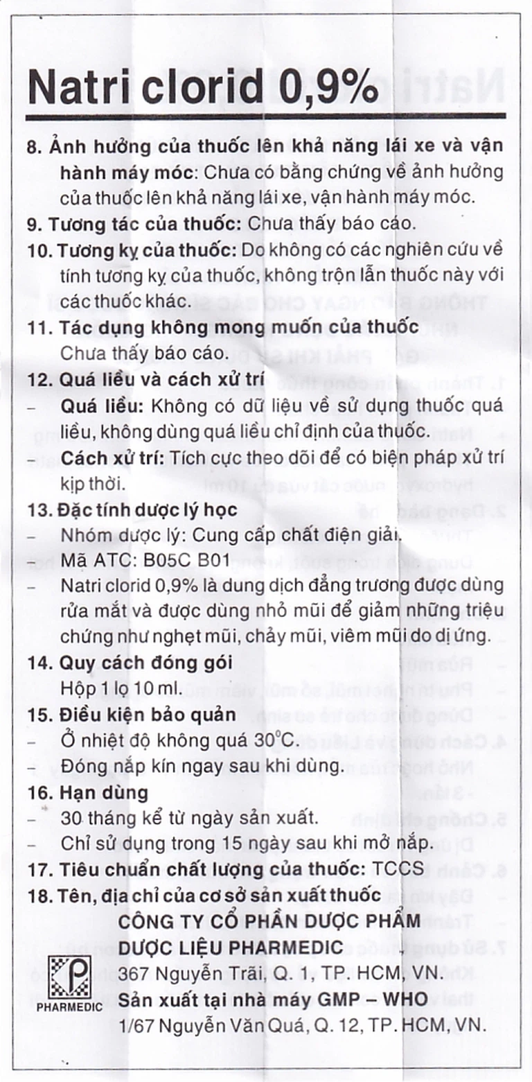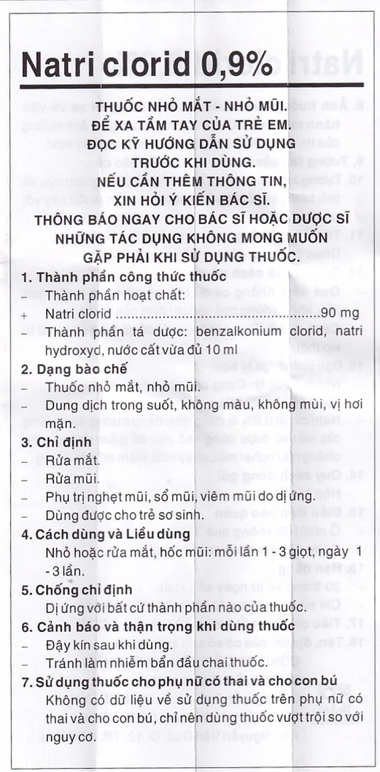 Dung dịch Natri Clorid 0,9% dùng nhỏ hoặc rửa mắt, hốc mũi.