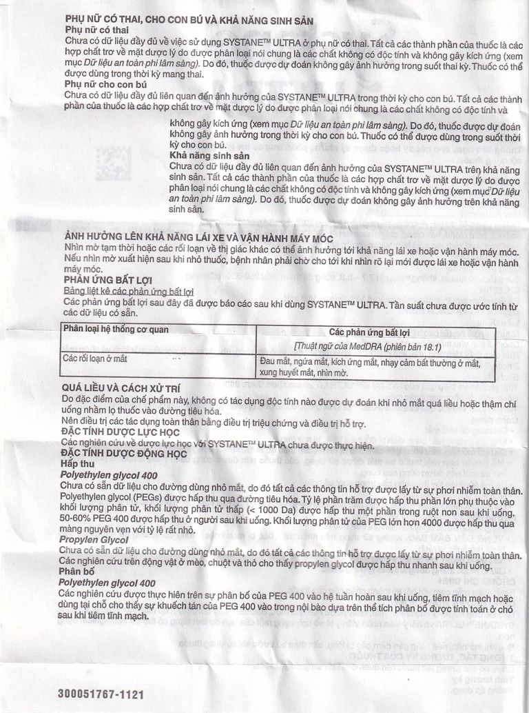 Tính an toàn và hiệu quả của Systane Ultra 5ml ở các đối tượng bị bệnh gan/thận chưa được thiết lập.