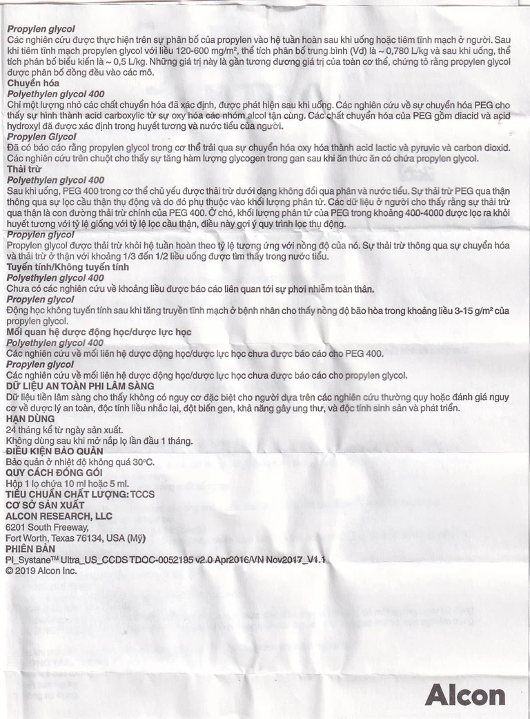 Thuốc nhỏ mắt Systane Ultra 5ml của Alcon Laboratories, inc., chứa dược chất chính gồm polyethylen glycol 400 và propylen glycol, được dùng để làm giảm tạm thời các chứng rát và kích ứng do khô mắt.