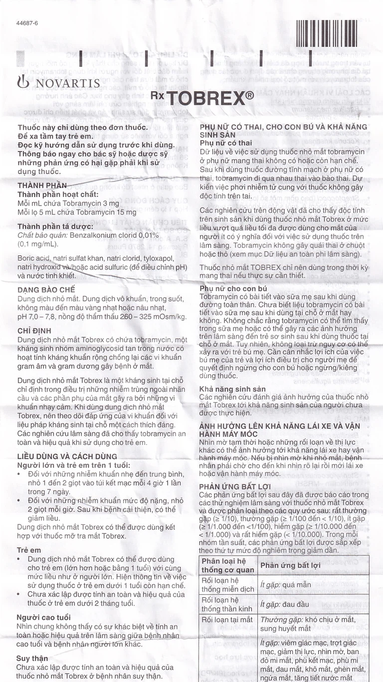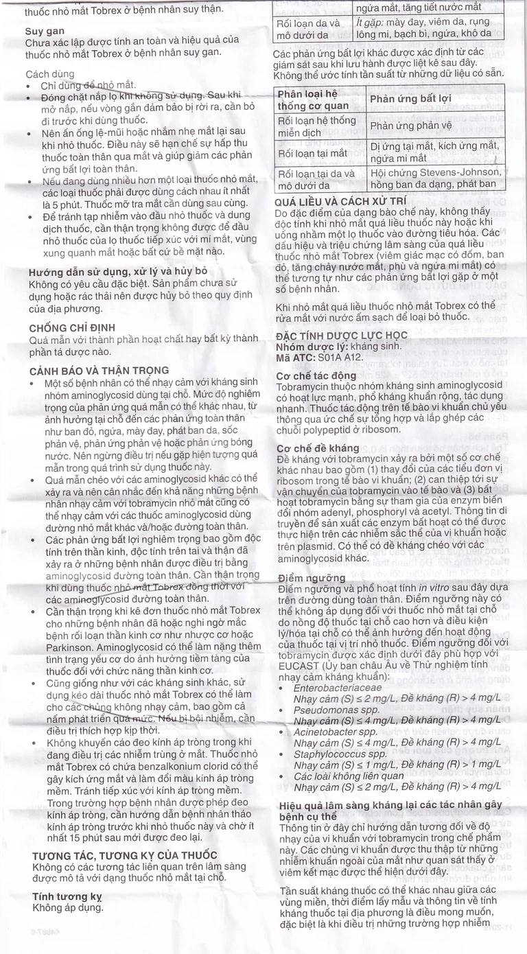- Khi dùng dung dịch nhỏ mắt Tobrex, nên theo dõi đáp ứng của vi khuẩn đối với liệu pháp kháng sinh tại chỗ một cách thích đáng. Thuốc đã được nghiên cứu về hiệu quả và an toàn khi sử dụng cho trẻ em.