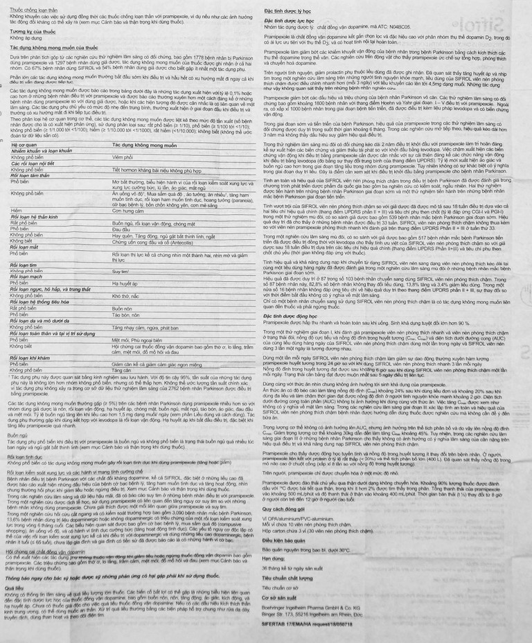 Hiệu quả đã được duy trì ở 87 trong số 103 bệnh nhân chuyển sang dùng Sifrol 0.375 mg Boehringer 3 x 10 viên nén phóng thích chậm. Trong số 87 bệnh nhân này, 82,8% số bệnh nhân không thay đổi liều dùng, 13,8% tăng và 3,4% giảm liều dùng. Trong một nửa số 16 bệnh nhân không đáp ứng tiêu chí về hiệu quả duy trì theo thang điểm UPDRS phần II + III, sự thay đổi so với thời điểm bắt đầu không có ý nghĩa về mặt lâm sàng.