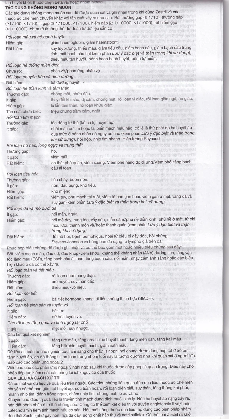 Quá mẫn, phù mạch có thể xảy ra tại bất kỳ thời điểm nào trong khi điều trị. Trong trường hợp này, cần ngưng dùng Zestril ngay lập tức và tiến hành điều trị và theo dõi thích hợp để đảm bảo rằng các triệu chứng được giải quyết hoàn toàn trước khi bệnh nhân xuất viện. Ngay cả trong trường hợp sưng phù chỉ khu trú ở lưỡi, không gây suy hô hấp, bệnh nhân cần được tiếp tục quan sát vì việc điều trị bằng thuốc kháng histamin và corticosteroid có thể không đáp ứng đủ.