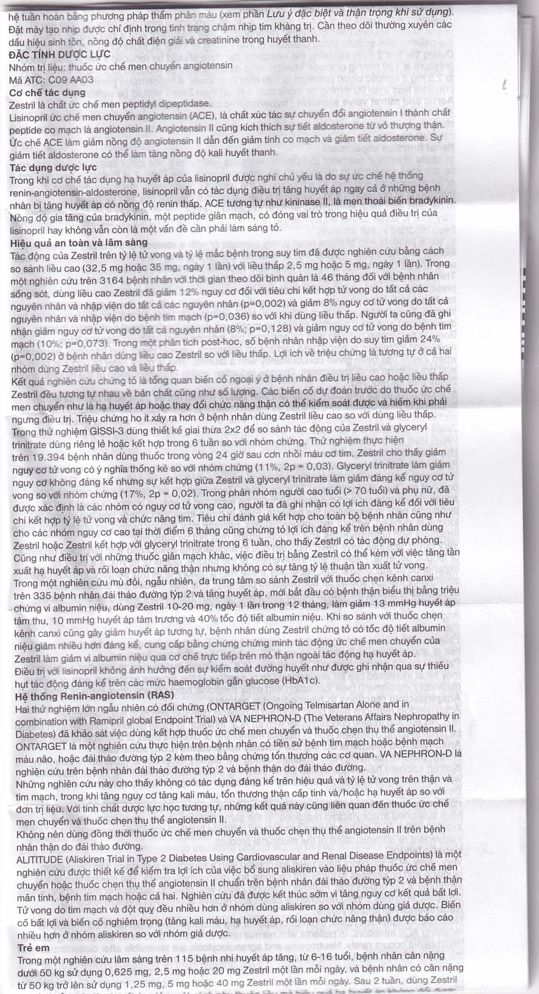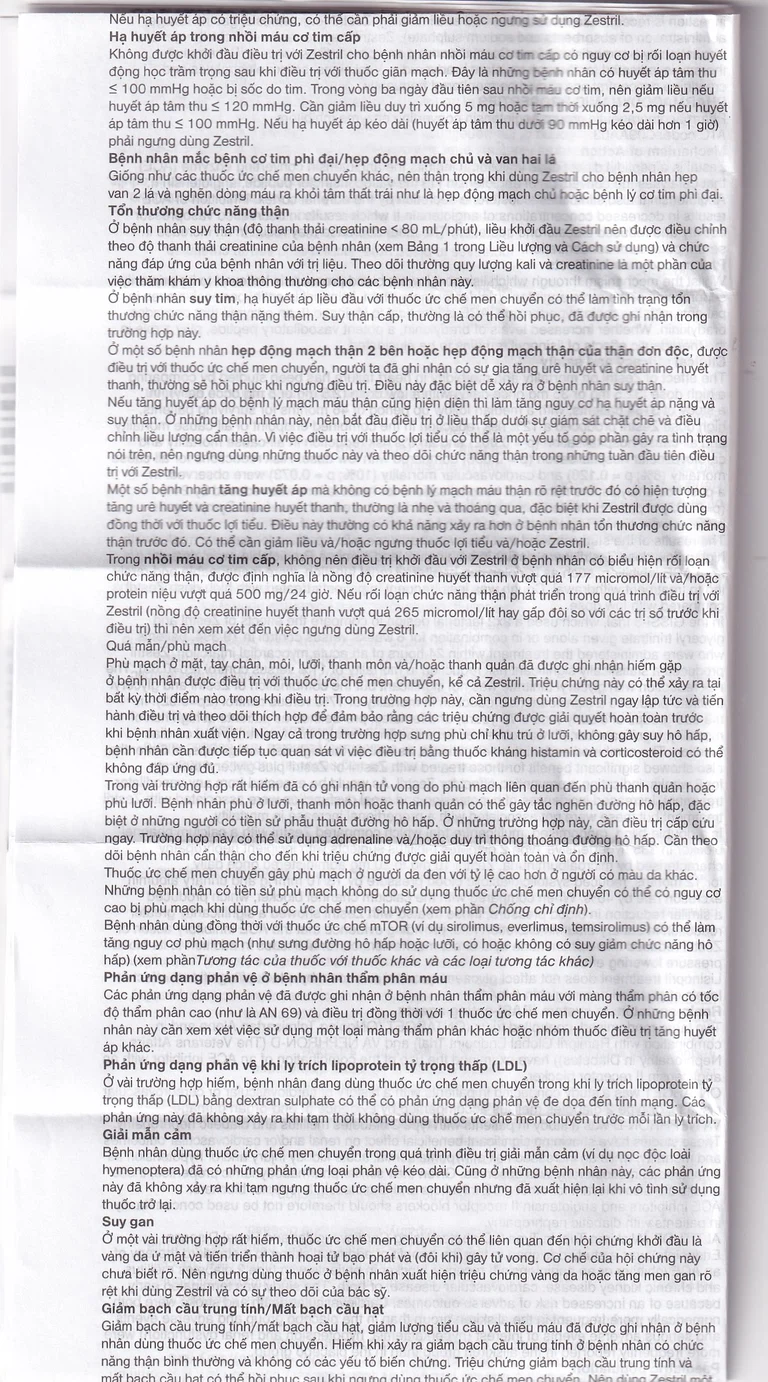 - Quá mẫn với Zestril hoặc bất kỳ tá được nào hoặc các thuốc ức chế men chuyển angiotensin (AE) khác.