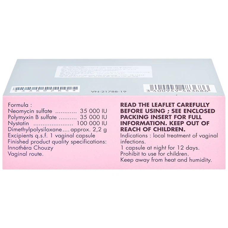 Do chưa có số liệu về khả năng hấp thu neomycin và polymicin B của niêm mạc âm đạo, nên nguy cơ ảnh hưởng toàn thân, đặc biệt trong trường hợp suy giảm chức năng gan, thận và bị bệnh tiểu đường là không thể loại trừ 1g màng ngăn âm đạo hoặc bao cao su, do nguy cơ bị vỡ, rách do thuốc.