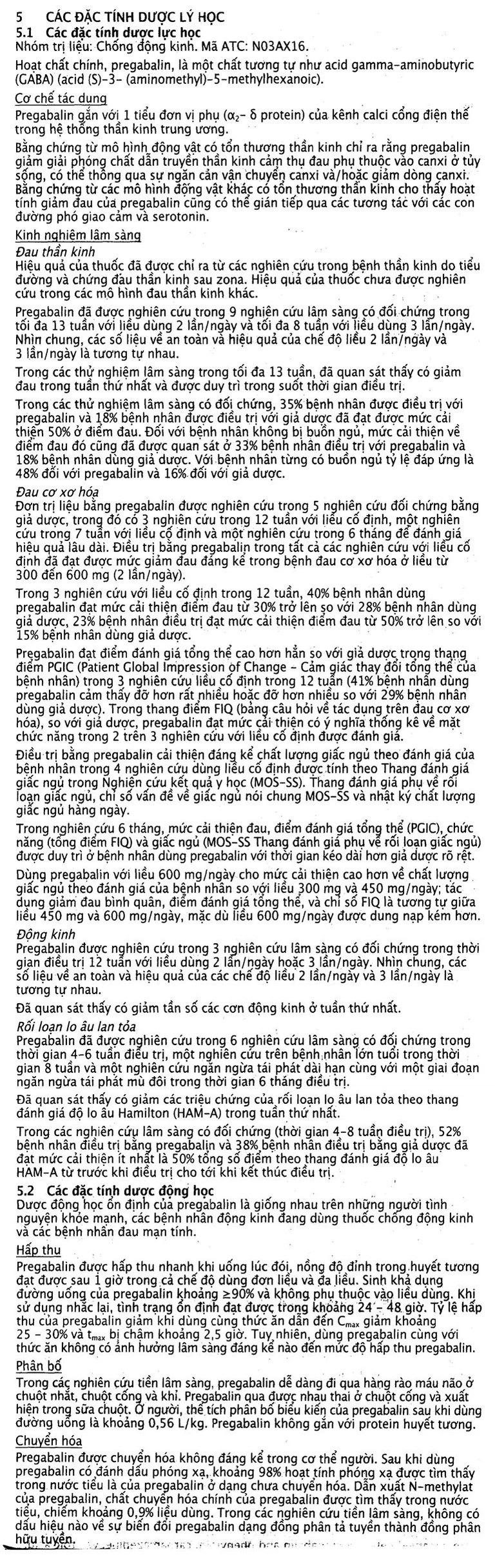 Hoạt chất chính, pregabalin, là một chất tương tự như acid gamma – aminobutyric (GABA) (acid (S) – 3 – (aminomethyl – 5 – methylhexanoic).
