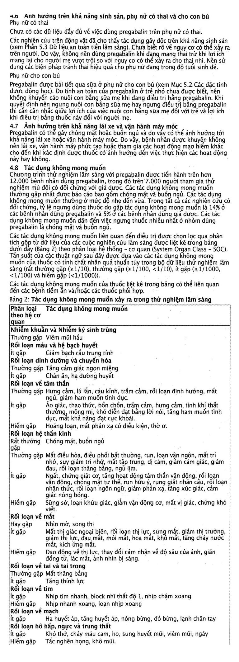 Các nghiên cứu trên động vật đã cho thấy tác dụng gây độc trên khả năng sinh sản (xem Phần Dữ liệu an toàn tiền lâm sàng). Chưa biết rõ về nguy cơ có thể xảy ra trên người. Do vậy, không nên dùng pregabalin khi đang mang thai trừ khi lợi ích mang lại cho người mẹ vượt trội so với nguy cơ có thể xảy ra cho thai nhi. Nên sử dụng các biện pháp tránh thai hiệu quả cho phụ nữ đang trong độ tuổi sinh đẻ.