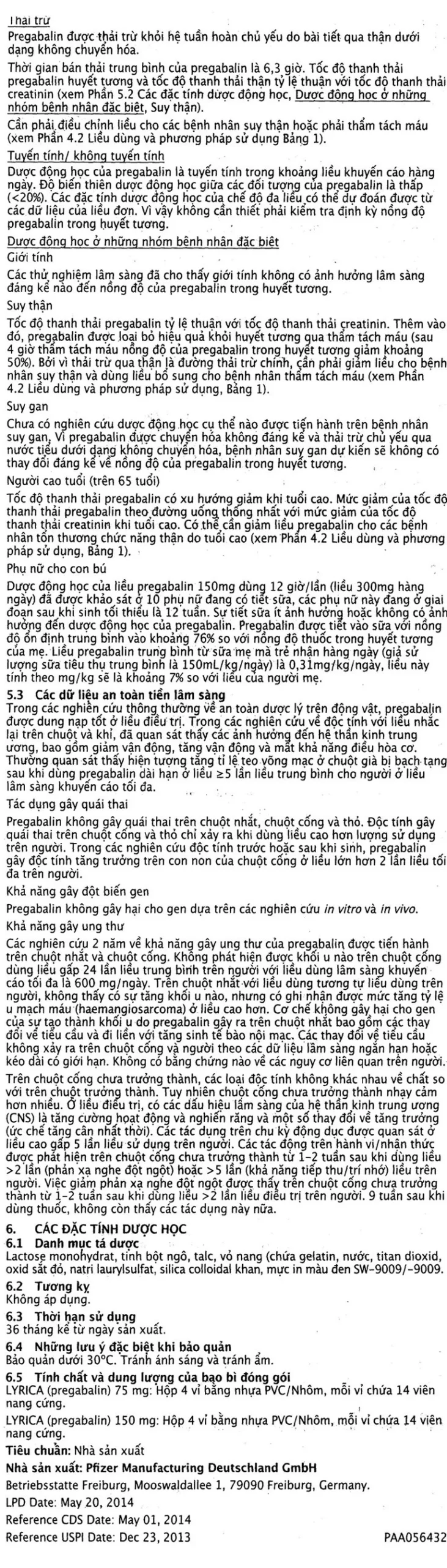 Dược động học của liều pregabalin 150mg dùng 12 giờ/lần (liều 300mg hàng ngày) đã được khảo sát ở 10 phụ nữ đang có tiết sữa, các phụ nữ này đang ở giai đoạn sau khi sinh tối thiểu là 12 tuần. Sự tiết sữa ít ảnh hưởng hoặc không có ảnh hưởng đến dược động học của pregabalin. Pregabalin được tiết vào sữa với nồng độ ổn định trung bình vào khoảng 76% so với nồng độ thuốc trong huyết tương của mẹ. Liều pregabalin trung bình từ sữa mẹ mà trẻ nhận hàng ngày (giả sử lượng sữa tiêu thụ trung bình là 150ml/kg/ngày) là 0,31mg/kg/ngày, liều này tính theo mg/kg sẽ là khoảng 7% so với liều của người mẹ.