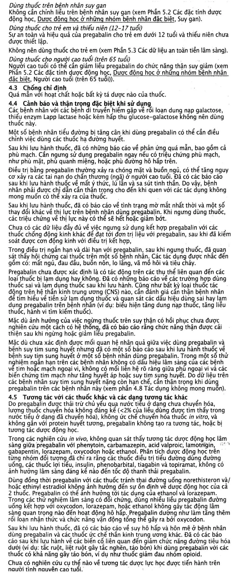Sau khi lưu hành thuốc, đã có các báo cáo về suy hô hấp và hôn mê ở bệnh nhân dùng pregabalin và các thuốc ức chế thần kinh trung ương khác. Đã có các báo cáo sau khi lưu hành về các biến cố liên quan đến giảm chức năng đường tiêu hóa dưới (ví dụ: Tắc ruột, liệt ruột gây tắc nghẽn, táo bón) khi dùng pregabalin với các thuốc có khả năng gây táo bón, ví dụ như thuốc giảm đau nhóm opioid.