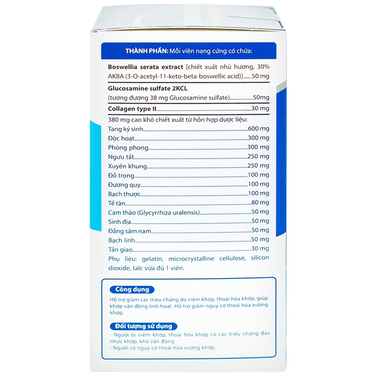 Chiết xuất nhũ hương: AKBA chiết xuất từ nhũ hương giúp chống viêm khớp, giảm đau nhức xương khớp. Với định lượng chuẩn 30% AKBA giúp cải thiện sớm mức độ đau khớp và giúp khớp vận động linh hoạt hơn. Cơ chế chống viêm của nhũ hương gần giống với steroid, hoạt động khác với thuốc giảm đau hay NSAID (nhóm thuốc chống viêm không steroid) và có khả năng dung nạp tốt hơn.