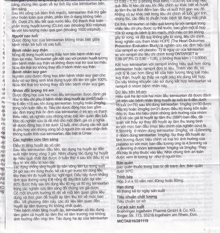 Trẻ em và thiếu niên: Chưa thiết lập được tính an toàn và hiệu quả của Micardis đối với việc sử dụng ở trẻ dưới 18 tuổi.