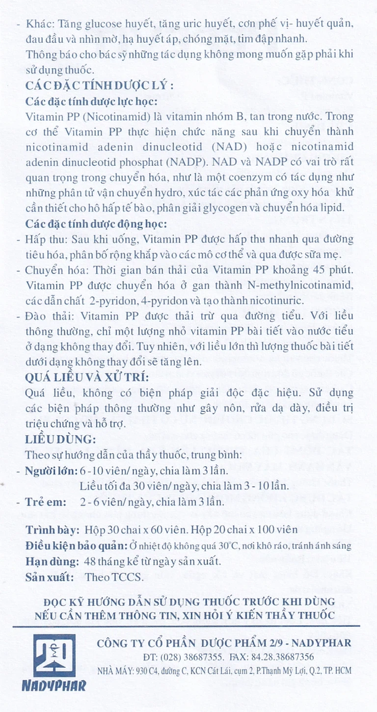 Chuyển hóa: Vitamin PP được chuyển hóa ở gan thành N-methylnicotinamid, các dẫn chất 2-pyridon, 4-pyridon và tạo thành nicotinuric.