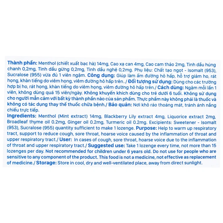 Ngậm mỗi lần 1 viên, không dùng quá 15 viên/ngày