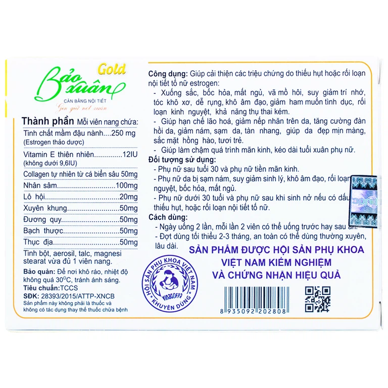 Bảo Xuân Gold sở hữu thành phần tinh chất mầm đậu nành có chứa isoflavone có cơ chế hoạt động gần giống estrogen nội sinh trong cơ thể phụ nữ từ đó giúp bổ sung và cân bằng nội tiết tố thiếu hụt an toàn và hiệu quả. Từ đó giúp cải thiện các triệu chứng do thiếu hụt hoặc rối loạn nội tiết tố nữ như xuống sắc, mất ngủ, bốc hỏa, vã mồ hôi, tóc khô xơ, dễ gãy rụng, rối loạn kinh nguyệt, khả năng thụ thai kém và suy giảm trí nhớ.